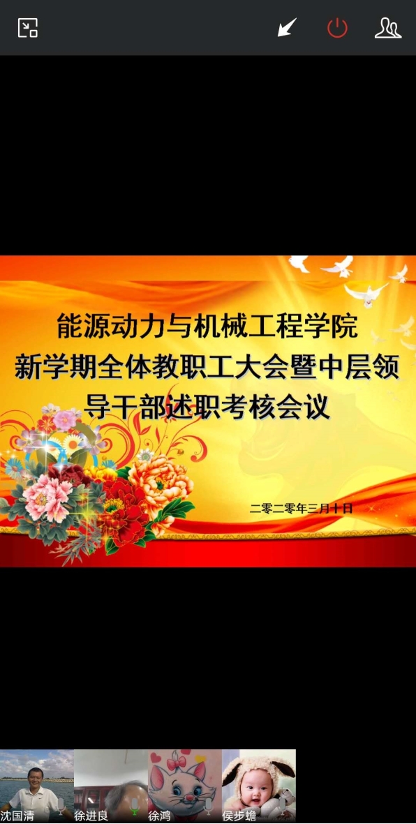 3月10日,能动学院召开新学期教职工大会暨中层领导干部考核述职会议,因疫情防控需要,本次大会采用企业微信网络方式召开,181名教职工参加了本次会议。